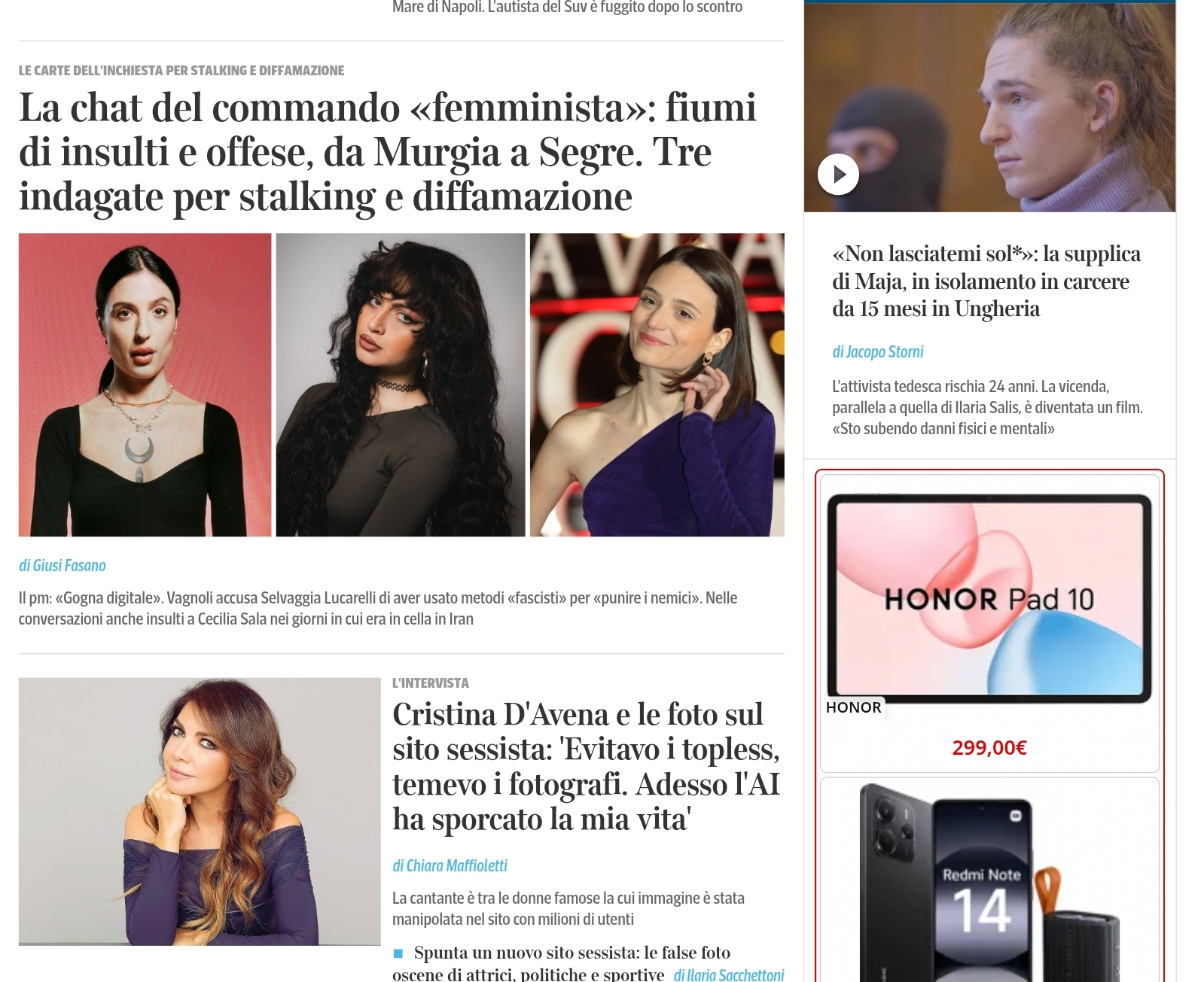 >Carlotta Vagnoli e Valeria Fonte indagate per stalking e diffamazione, le chat «femministe» al veleno: insulti a Murgia, Segre, Mattarella >Selvaggia Lucarelli ha pubblicato alcuni estratti delle chat che per il pm costituiscono una «gogna digitale». Ora Vagnoli accusa la giornalista di aver usato metodi «fascisti» per «punire i nemici». Nelle conversazioni anche insulti a Cecilia Sala nei giorni in cui era in cella in Iran