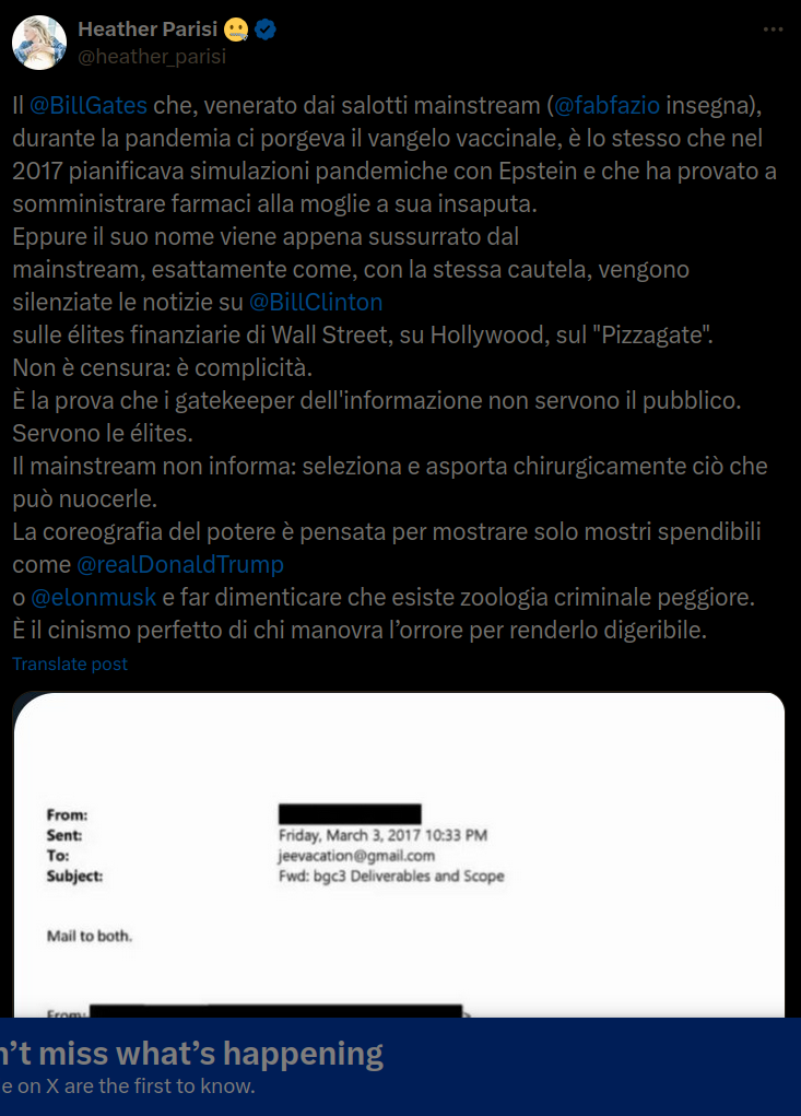 >>214755 L'"email" a BillGheiz infatti ha Epstein sia come mittente che destinatario – praticamente se le è scritta e mandata da solo, a differenza di tutte le altre vere conversazioni con Musk, Thiel, Bannon, la Rowling, etc.