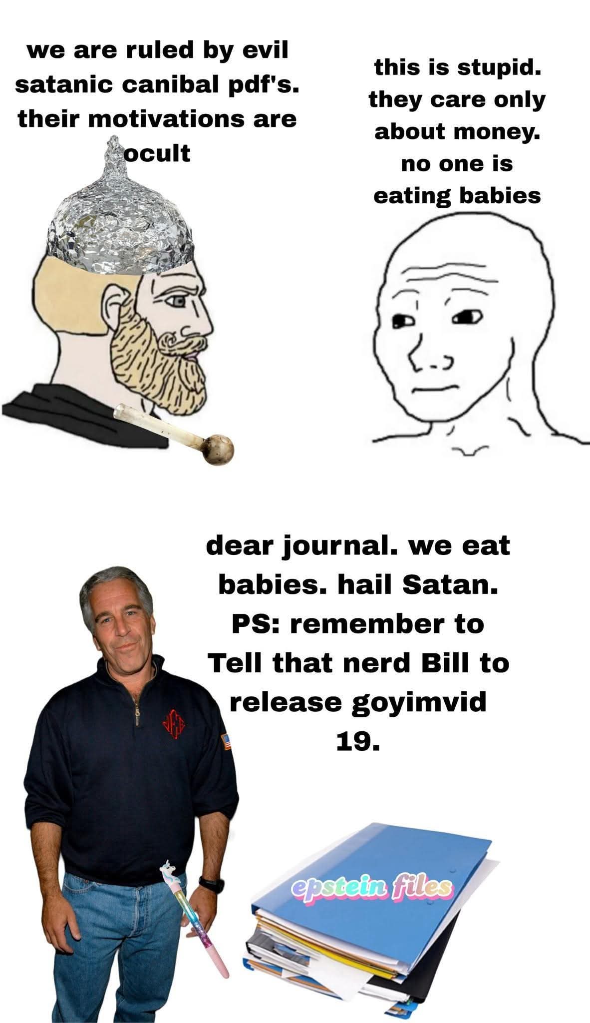 >meme: cabala di pedofili satanisti che controllano il mondo con sacrifici umani e magia nera >realtà: 4 morti di figa autistici che scopano a pago le 15+ e sono così stupidi da prendersi pure le STD