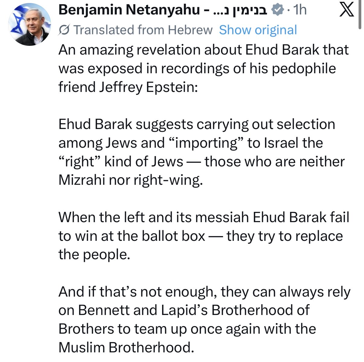 >>214999 lol, o sei cieco o sei circonciso, il tipo viveva in simbiosi con un primo ministro israelino di nome ehud, suo suocero è letteralmente sepolto nel pantheon di israele, ci sono le sue foto con le magliette dell' IDF . https://x.com/alon_mizrahi/status/2018948945544696171 Cosa vorresti, la fattura ?