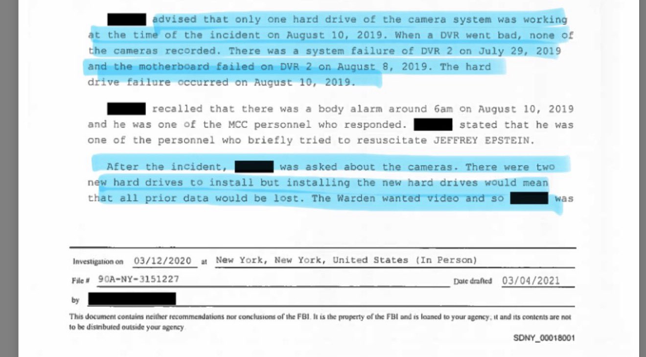 >il giorno del "suicidio" di Epstein (leggi: fatto ammazzare da Trump) cambiarono volutamente gli hard disk delle telecamere, causandone la mancata registrazione della cella e la perdita dei dati >Epstein dichiarato morto già un giorno prima del suo "suicidio" (anche il giorno della settimana è quello del 9 agosto, quindi non è un refuso), e solo il 10 agosto viene aggiunta la causa di morte per suicidio