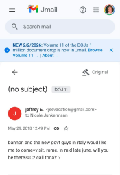 Ohibò: il 29 marzo 2018 Epstein scrive all'imprenditrice Junkermann che Bannon (al soldo della CIA), assieme ad esponenti del "nuovo governo in Italia" volevano che lui venisse in Italia (Roma) verso la metà di giugno per incontrarli